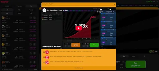 Aviator oʻyini — bu Spribe studiyasi tomonidan ishlab chiqilgan va kresh-mexanikaga asoslangan dinamik geympleyga ega mashhur loyihadir. Bu apparatda koeffitsient har soniyada oʻsib boradi va foydalanuvchining vazifasi — samolyot qulashidan oldin pulni yechib olishga ulgurishdir. Bu yerda imkoniyatlardan biri roʻyxatdan oʻtmasdan Aviator online tarzda bepul oʻynashdir.